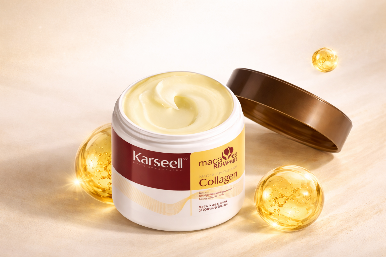 Mascarilla intensiva con colágeno y maca para mejorar la suavidad y la manejabilidad en solo 10 minutos.